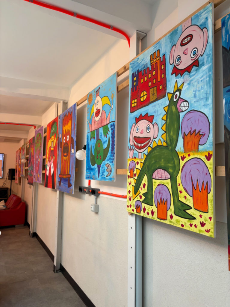 Benvenuti! Questo è l’atelier dei Cervelli Ribelli di via Gulli a Roma. Abbiamo pensato, immaginato questo luogo per il benessere, la felicità dei ragazzi autistici come mio figlio Tommy. I quadri che vedete qui attorno sono di Tommy, ma ci sono anche altre opere, perché ci sono anche vari altri ragazzi che vengono qui.